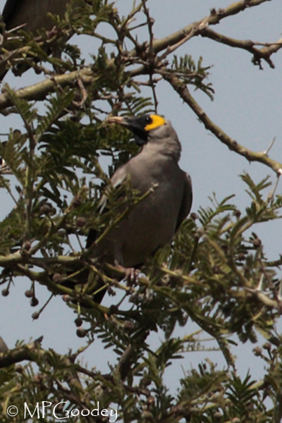 Also in the dry zone, yet rather scarce at this cool time of year, is another starling of somewhat sombre hue, for which the far rarer Fischer’s might be mistaken at a considerable distance. This is the Wattled Starling, Creatophora cinerea, a very Sturnus starling -like bird, that follows the great ungulate herds on their seasonal migrations and frequently descends onto Maasailand in hundreds of thousands. In wetter years like last, they breed in great number near the northern border of Arusha National Park when grasshoppers, upon which they more or less depend, are abundant. In January 2007, immersed in those greening, grasshoppering, El Nino rains, hundreds of pairs nested around the wonderful Hemingway’s Camp (established by Hoopoe Safaris) on the abnormally verdant plains of West Kilimanjaro ranch. Groups of garrulous, jostling males made for a truly fantastic sight as they displayed upon the stunted green whistling thorn acacias, wings flapping, floppy flat black wattles all-aquiver. As they sing surely those wattles must tickle their bald but golden pates?