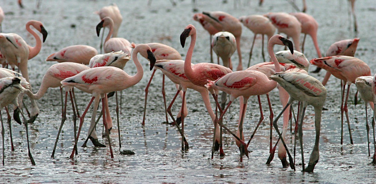 There are several secret spots in the park that range from lush, reed-fringed freshwater pools, where chestnut African Jacanas (Lillytrotters) pick their way daintily between snoozing hippos; to crusty soda lakes whose alkaline waters are liberally sprinkled with Cape Teal, Pied Avocets, Ruff and huge flocks of two kinds of elegant flamingo – the rich pink Lesser and the lanky rose-red Greater.