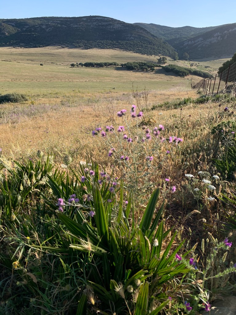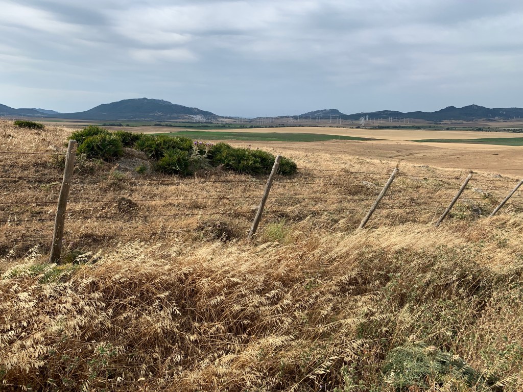 I first become aware of the highway N-340 at 0845. Visually two large yellow combine harvester are resting in the corner of one vast toxic wheat field, down in the valley, toward the village of Facinas. Spanish Sparrows are zooming hither and back, do they know?