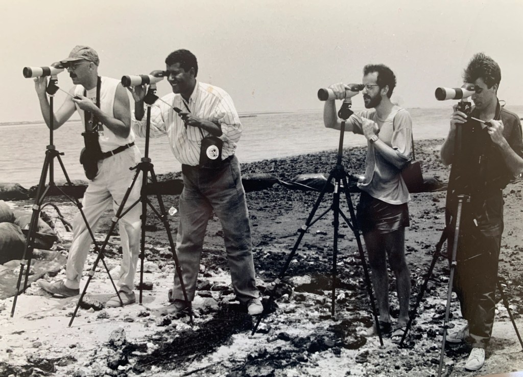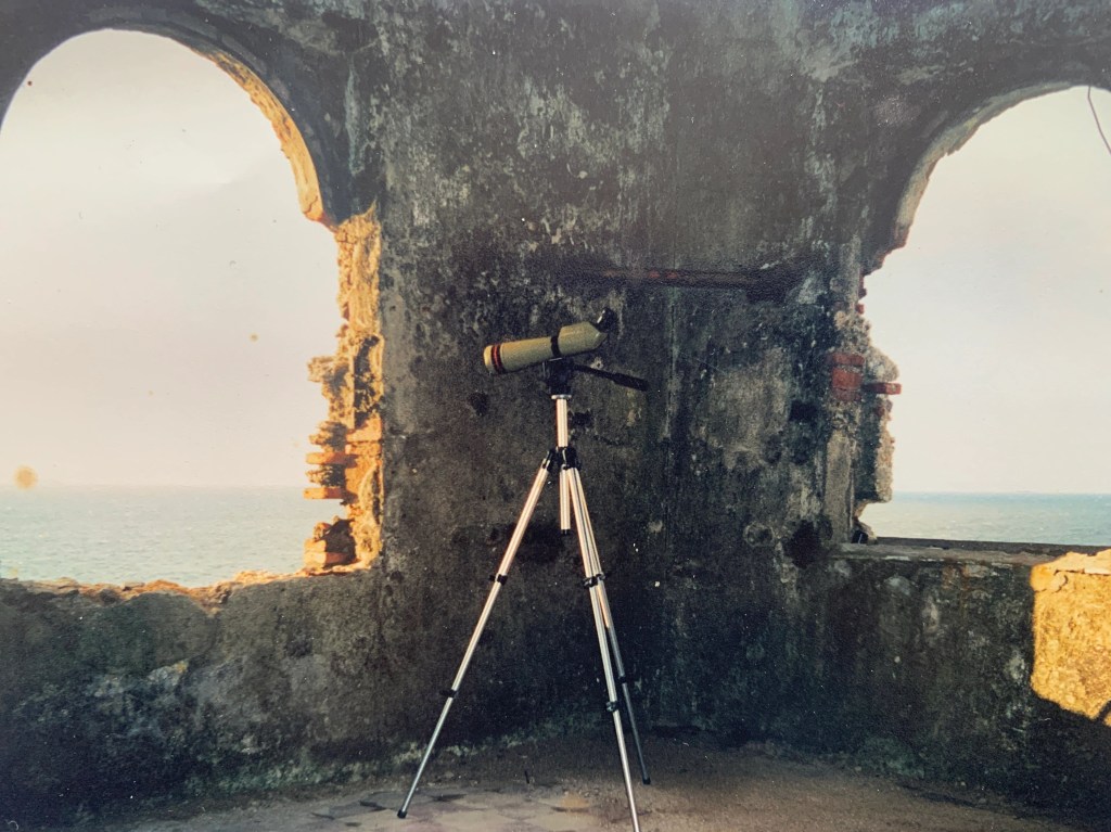Raven-haired and always friendly Manolo is the lonely civil guard on duty. He ushers me through. As ever he is cheerful and dismissive of the status quo. After a little of what one might call Spanish elevator chat, chiefly about the weather and the non-durability of aluminium as a tripod component, I hurry-on towards the crumbling castello. David and Oriol are already there, monitoring seabird migrations from the upper floor. Bedecked in woolly hats and muffled by Palestinian scarves, their telescopes protrude pointedly from the long blown-out and frameless windows. For all the world they might be snipers in some shattered war-torn villa of the “near or Middle East”!