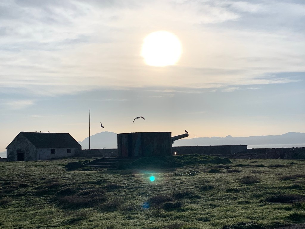 1440 : “two Snake Eagles closing”. One whizzes past and is carried way out west over the ocean. The other, evidently struggling, is going down. Gaping visibly and, at two hundred metres out, perilously close to the sea’s surface, it only just manages to cross the shoreline, a little east of the lighthouse and less than a metre above the jagged rocks. After almost cartwheeling across the island, scattering squads of iridescent black and spotless starlings who are feeding on the former field of sports, it tumbles gasping onto the sandpile. That’s exactly where the Black Kite landed earlier, in the shelter of the immigrant detention centre! There it rocks back-and-forth on splayed talons in the eddying gusts, for about eight minutes, looking all about it. Golden eyes in soft shawled, tightly feathered head, it really is like some beautiful feathered cat. Then it rises. And instantly disappears, past the ancient rusted artillery pieces from the Civil War that point north-westwards over the outer cliffs.